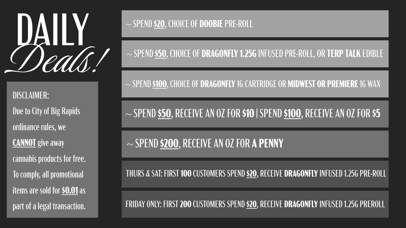 At our cannabis dispensary in Big Rapids, our budtenders are the heart of what makes us stand out from the competition. These highly knowledgeable professionals are trained to guide you to the best cannabis products Big Rapids has to offer, tailored to your exact needs. They invest time in understanding our wide range of products, ensuring they can match what we carry to your unique experience. Unlike some shops where clerks may push their personal favorites, our budtenders recognize that each person’s experience with marijuana is personal and different. Whether you’re taking advantage of our curbside pickup dispensary service in Big Rapids or browsing the latest dispensary deals, you can trust our team to help you find the best weed deals Big Rapids has available.
